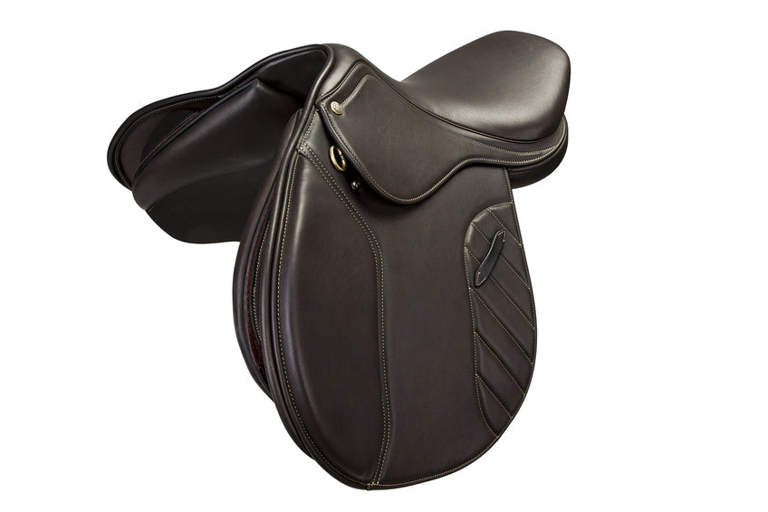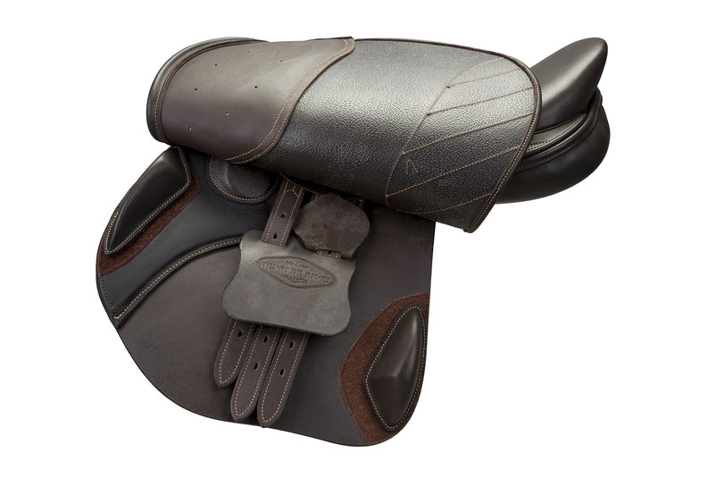 The Henri de Rivel Synergy Close Contact Saddle provides a close feel of the horse's back. The IGP (Interchangeable Gullet System) is convenient for riders that need to fit multiple horses or for horses that have changing muscle tone throughout the year. Ideal for jumpers or eventers, this saddle features a forward flap and medium seat to allow for a correct position and balance over fences and variable terrain. Knee and thigh blocks are placed strategically to encourage a proper leg position for stability over fences. Covered leather provides a soft and grippy texture that accepts oiling and leather conditioners. This saddle boasts a sporty look with signature stitching. All Henri de Rivel IGP saddles come equipped with a regular width gullet.